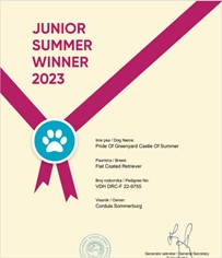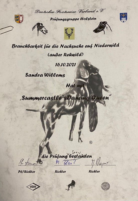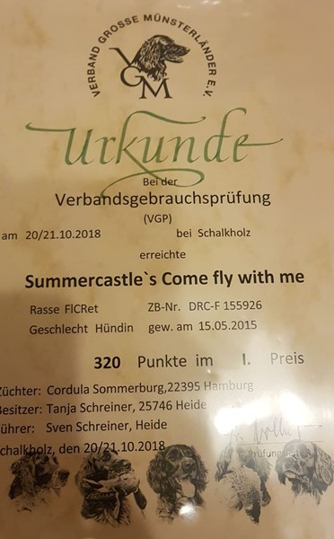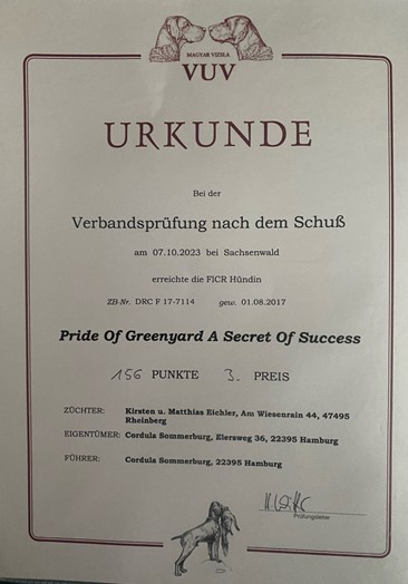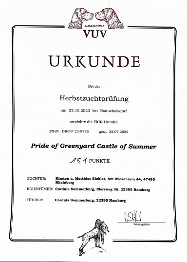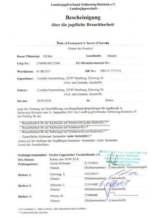 Summer (Pride of Greenyard Castle of Summer) besteht die HZP und mit den Zusatzfächern Gehorsam hat sie damit die jagdliche Brauchbarkeit bescheinigt bekommen. |