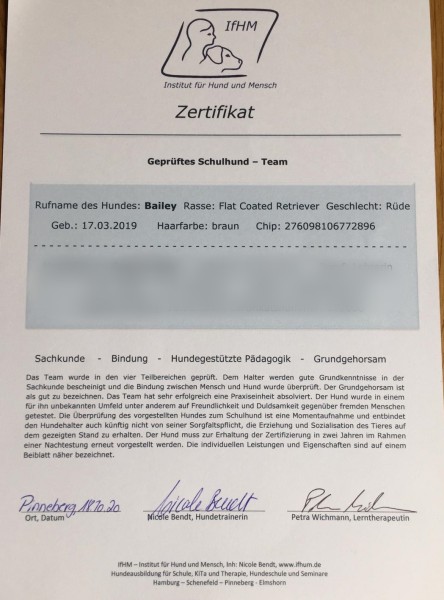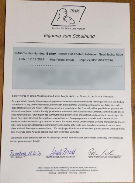 Sie wird zukünftig als Schulhund für gute Stimmung im Klassenzimmer, und somit für ein verbessertes Lernverhalten bei den Kindern sorgen.